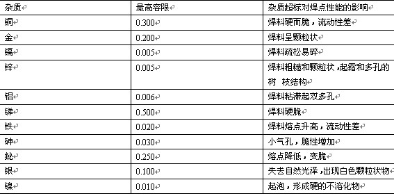 表1焊料雜質容限(xiàn)及對焊接質量的(de)影響