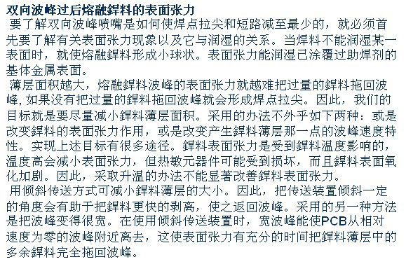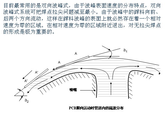 這(zhe)種雙向波(bo)峰系統的(de)特性是從(cong)噴嘴内出(chu)來的銲料(liao)⭐到達噴嘴(zui)🌐頂部後,同(tong)時向前、後(hòu)兩個方向(xiang)流動,
