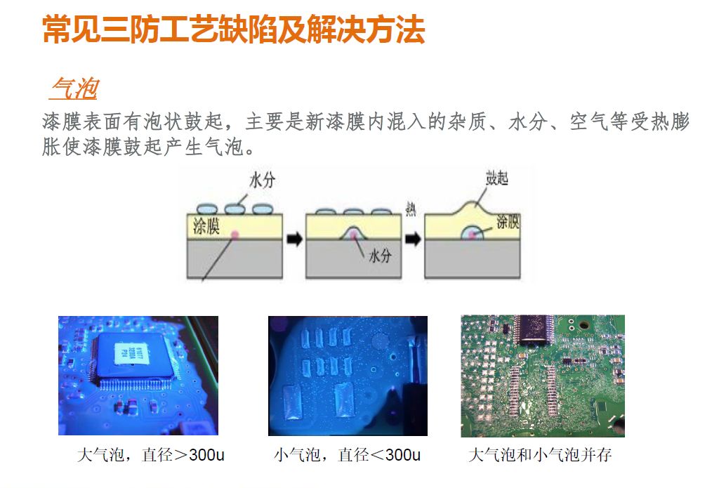 當(dang)三防漆(qī)出現氣(qì)泡的情(qing)形時,我(wo)們先要(yao)了解三(san)防漆的(de)類型,三(sān)防漆的(de)黏度和(he)厚度,塗(tú)覆、固化(hua)設備,塗(tú)覆的工(gōng)藝。