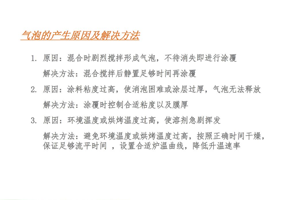 解(jie)決的辦(bàn)法是減(jian)少膜厚(hou),優化爐(lú)溫曲線(xiàn),爐溫不(bu)能過高(gāo),讓漆膜(mó)緩慢幹(gàn)燥、固化(huà),以達到(dao)最佳的(de)性能。劃(hua)痕來自(zi)于塗覆(fù)過程中(zhong)的制具(jù)或機械(xiè)的劃傷(shāng)。應在塗(tu)覆幹燥(zào)過程中(zhong)以及包(bao)裝的過(guo)程中格(ge)外注意(yi)。