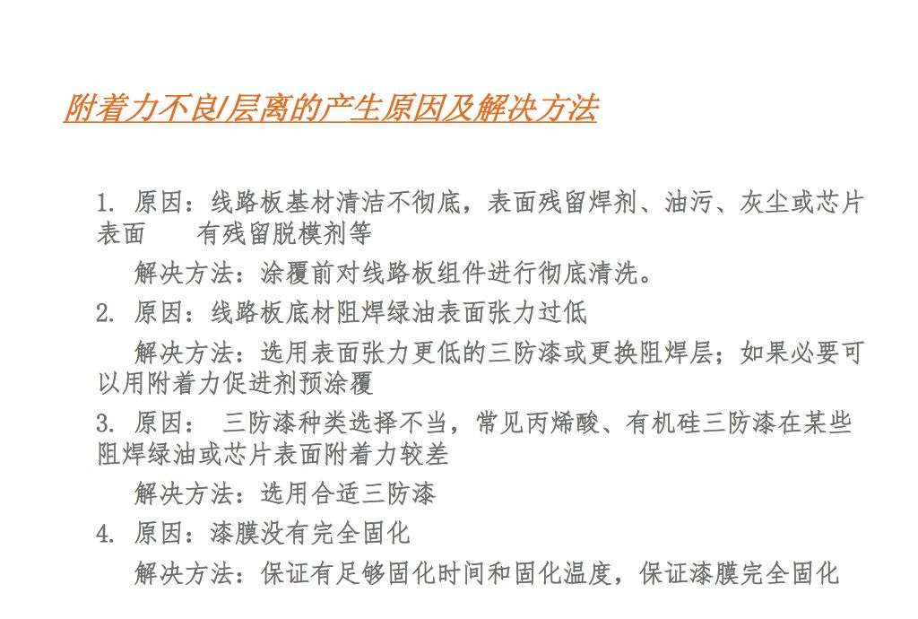 三防漆(qi)出現分(fen)層的現(xian)象,主要(yao)出現在(zai)元器件(jian)和阻焊(hàn)層上。