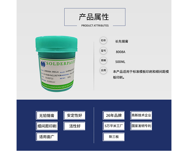 CX8008A屬(shu)于無鉛錫膏。粘度(du)安定性良好,運輸(shū)、保管、使用方便;良(liang)好的細間距印刷(shua)性能,印刷形狀精(jīng)細;預防預🧡熱時的(de)塌陷,有效防🏃🏻♂️止橋(qiáo)連及錫球的發生(shēng);活性好,适用面廣(guang)。